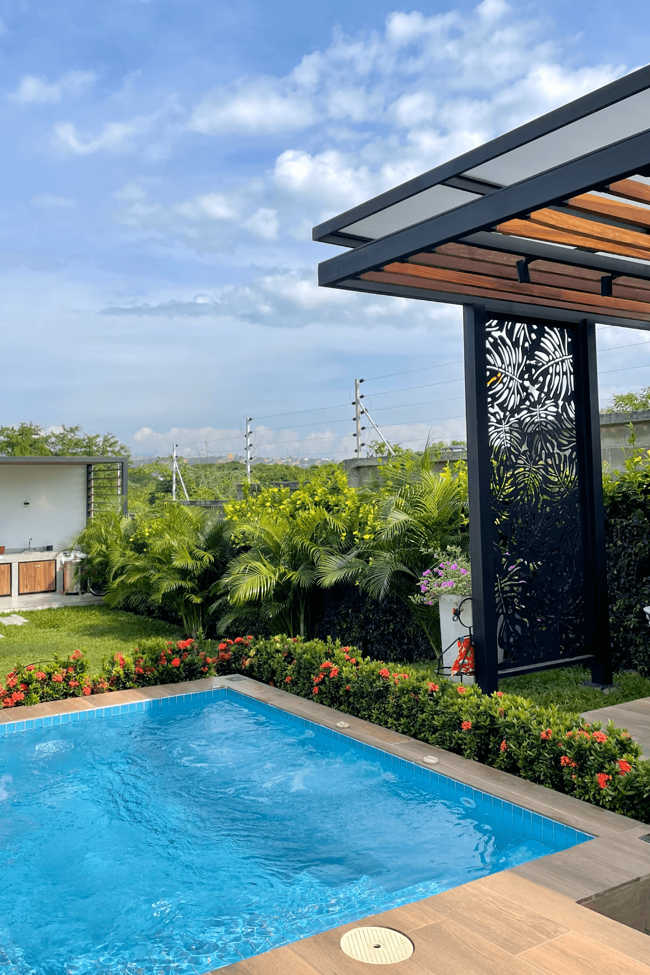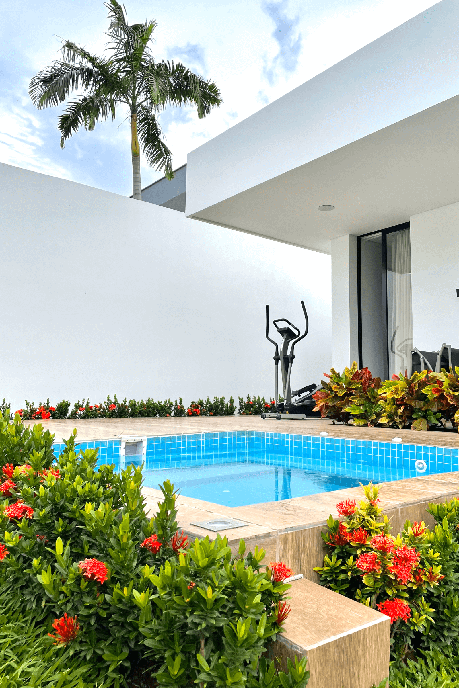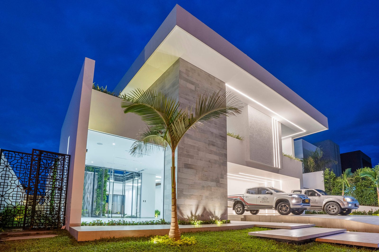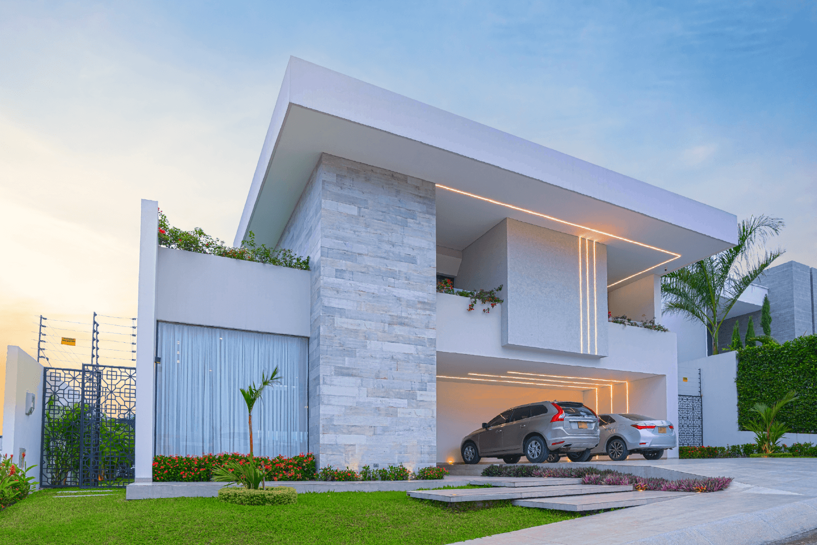 Este proyecto residencial de líneas limpias y geometría definida representa un equilibrio perfecto entre sofisticación, funcionalidad y estética contemporánea. La fachada principal combina texturas sutiles, colores claros, creando una composición armónica que resalta con iluminación arquitectónica cuidadosamente integrada; las jardineras lineales aportan un toque natural que suaviza la estructura. Mientras el diseño prioriza la simetría, el orden visual y la conexión con el paisaje, ofreciendo una experiencia residencial de alta categoría.